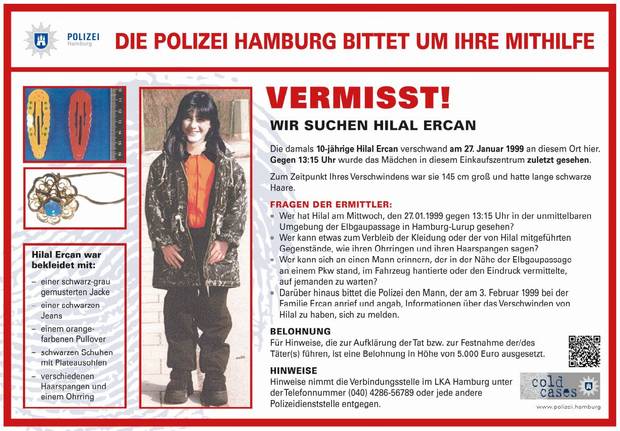 Der Fall lässt die Polizei nicht ruhen. 20 Jahre nach dem Verschwinden der damals zehnjährigen Hilal Ercan aus Hamburg starten die Ermittler einen weiteren Anlauf, um das Schicksal des Mädchens aufzuklären. „Wir bitten mögliche Zeugen, die sich bislang nicht bei uns gemeldet haben, weiterhin ausdrücklich darum, sich mit uns in Verbindung zu setzen“, sagte die zuständige Kriminalbeamtin Inge Pape zum Jahrestag.